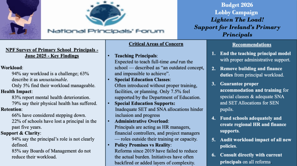 The National Principals’ Forum (NPF) calls on the Government of Ireland to urgently address the unsustainable conditions facing primary school principals. Based on the 2025 Principal Workload Survey (with over 400 respondents), it is clear that the role of school leadership is collapsing under the weight of unchecked responsibility, inadequate support, and unfulfilled policy promises.